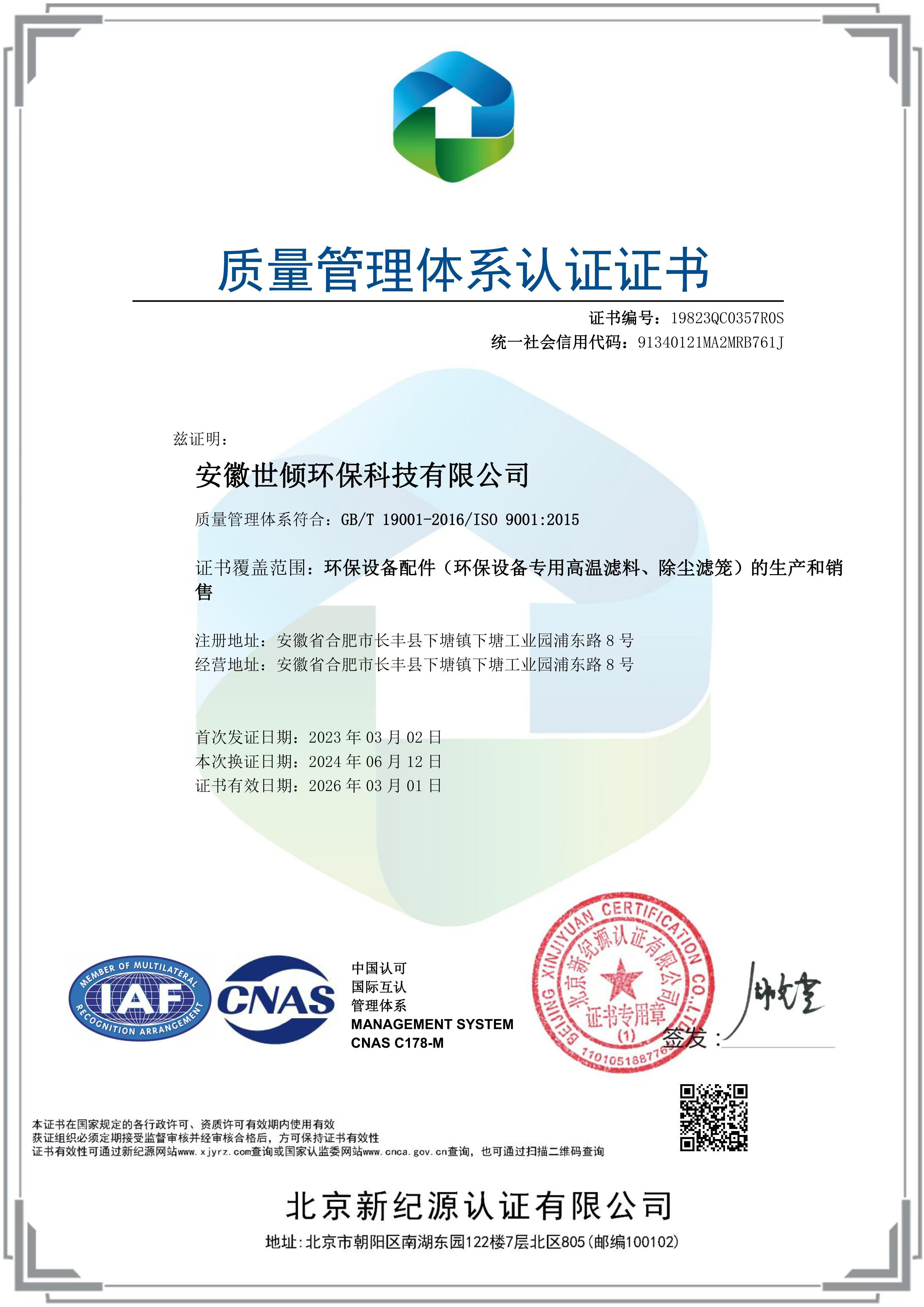 世傾環(huán)保成立于2012年,企業(yè)注冊資本6000萬元,是一家專注于環(huán)保高溫煙氣過濾材料研發(fā)與制造的國家高新技術(shù)企業(yè)。公司共有員工76人,大專以上學歷人員占比 35%,研發(fā)人員共有 7.8%人,其中具有非織造材料高級職稱占比3% ,中級職稱的 4%,碩士學歷 1 人,公司在合肥設有生產(chǎn)基地,生產(chǎn)面積16000㎡,擁有 3 條全自動高溫濾料生產(chǎn)線,2 條 PTFE 濾料專業(yè)生產(chǎn)線、 4條袋籠生產(chǎn)線及 1 條國內(nèi)先進的靜電噴涂生產(chǎn)線。產(chǎn)品涵蓋不同工況下的PTFE、玻纖復合氈、PPS、P84、芳綸、亞克力、滌綸、丙綸等多種功能型濾料、配套袋籠及塵硝一體化陶瓷濾管。