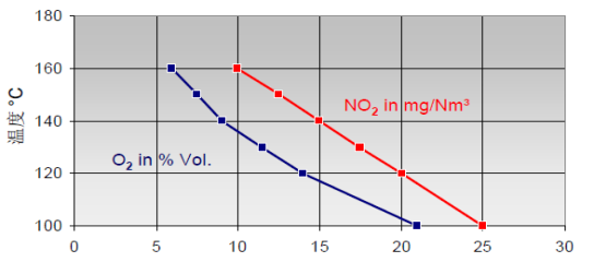 另外,燃煤煙氣中的SO3會與水發(fā)生不可逆反應而生成硫酸H2SO4。硫酸將不斷在濾袋或粉塵上霧狀結聚形成氣溶膠,氣溶膠會不斷濃縮對PPS濾袋和金屬部件進行強烈的氧化腐蝕。因此,必須控制好煙氣溫度,防止因煙氣結露造成對濾袋和設備的損傷。圖1-2表示了在不同氧化劑含量下PPS濾料最佳使用溫度范圍圖,從圖中可以看出,將煙氣中的O2控制在8%以下,NO2控制在15 mg/Nm3以下,PPS濾料的持續(xù)使用溫度范圍在100-150℃之間;持續(xù)使用溫度在180℃,煙氣中的O2控制在5%以下,NO2控制在5 mg/Nm3以下。